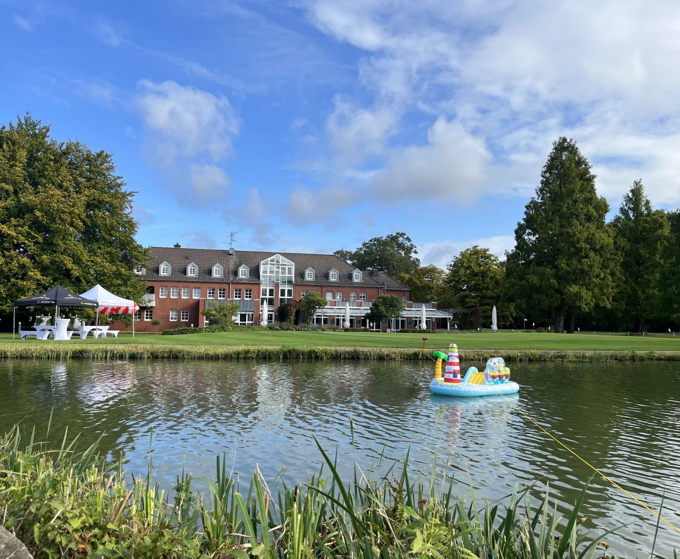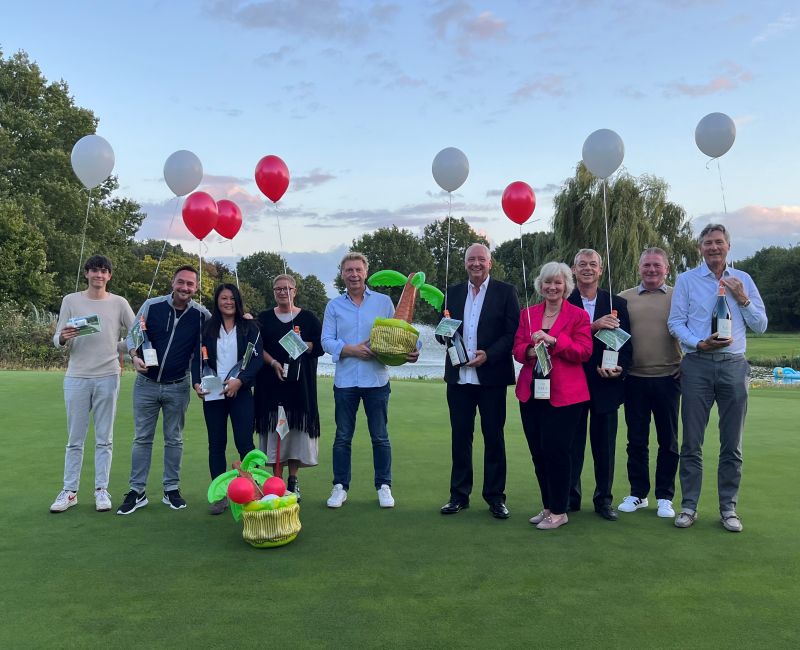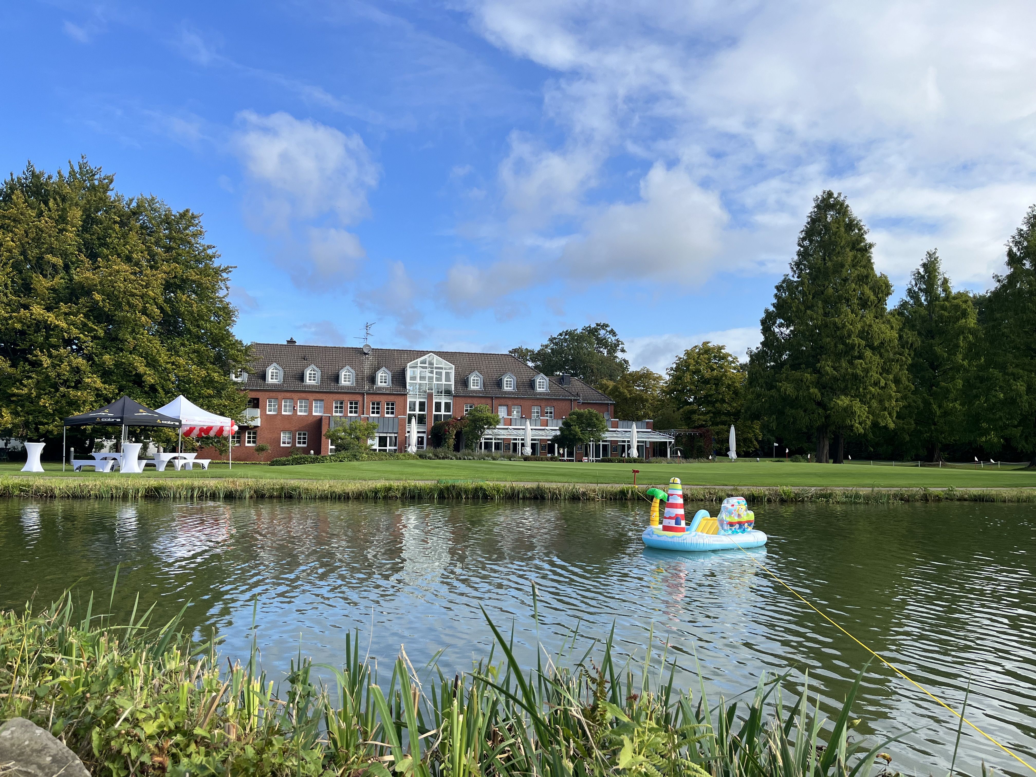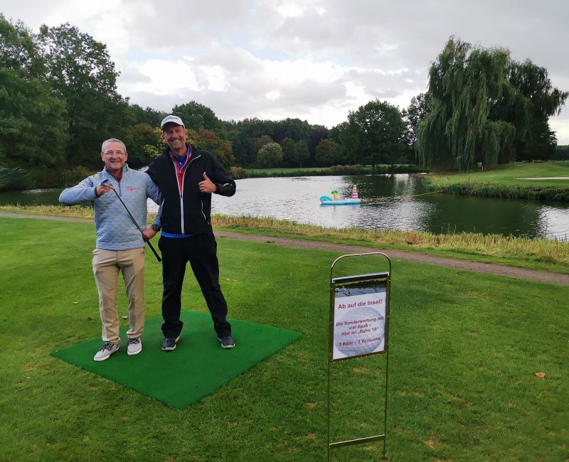 Treffpunkt und Get-Together nach der Golfrunde war die Sonderwertung „Ab auf die Insel“. Gut geschützt gegen den gelegentlichen Regen wurde sich dort zum „Gespräch nach der Runde“, einem Kölsch, Musik und Essen getroffen. Jede:r Spieler:in hat bei der Sonderwertung „Ab auf die Insel“ drei Versuche, einen Golfball auf die Insel im Teich zu spielen. Wie wir immer wieder feststellen müssen, ist es schwieriger, als es aussieht, die Insel zu treffen. Nur vier Spielern ist dies an diesem Tag gelungen. Die beiden ausgeschriebenen Preise wurden im Rahmen der Siegerehrung unter den vier Spielern verlost: Dr. Norbert Schöngen und Peter Riechert freuten sich über die aufblasbaren Inseln und eine gute Flasche Wein.