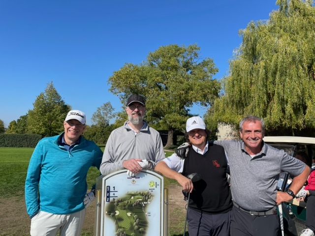 Morgens um 7 Uhr ging es mit dem Bus der Firma Hebbel los. Dort gab es Frühstück mit den liebevoll am Vorabend geschmierten Brötchen der letztjährigen Gewinner. Leider gab es ein Missverständnis bezüglich des Kaffees, so dass es zu dieser frühen Stunde keinen Kaffee im Bus gab. So startete die Gruppe am Golfplatz Kiawah in Riedstadt unterkoffeiniert, aber bei herrlichem Sonnenschein mit der ersten Turnierrunde. Der Platz war in einem guten Zustand, lediglich die Grüns waren etwas holprig. Dafür wurden wir mit außergewöhnlichen Skulpturen auf dem Platz verwöhnt. Die Siegerehrung der Gewinner des ersten Turniertages fand während des gemeinsamen Abendessens in dem hervorragenden Hotel Absolute statt. Michael Thoma holte sich mit 41 Nettopunkten den 1. Platz des Turniertages und in der Bruttowertung bestach Martyn Bennett mit 34 Bruttopunkten.