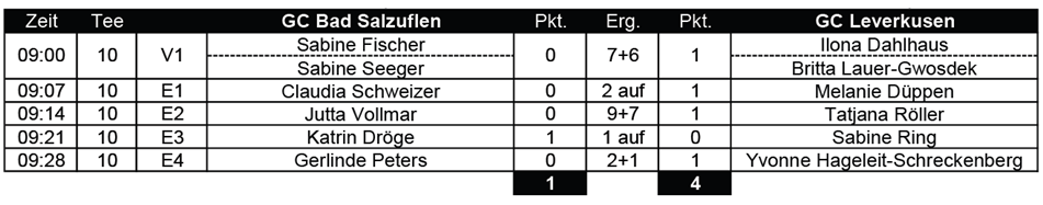 Sonntag: Unsere Wecker klingelten gegen sechs Uhr und der Blick aus dem Fenster verhieß nichts Gutes - regnete es doch schon wieder. Aber die Prognosen ab 9 Uhr, meine Startzeit für den Vierer mit Ilona Dahlhaus, sollten eintreffen. Es blieb trocken! Wir sind auf den ersten Löchern rasch in Führung gegangen. Fehler, die wir tags zuvor noch gemacht hatten, konnten wir abstellen. Dank konzentriertem Spiel, einem Sandybirdie und einem gelochten 20-Meter-Putt war unser Sieg bereits an Loch 14 perfekt . Der erste Punkt für Leverkusen. Tatjana Röller gewann ihr Matchplay deutlich an Bahn 13. Spannender wurde es bei Melanie Düppen, die schlussendlich auf der 18 zwei auf gewann. Somit war der Gesamtsieg frühzeitig besiegelt. Unsere Golfkolleginnen Yvonne Hageleit-Schreckenberg und Sabine Ring waren noch unterwegs und hatten vom Sieg nichts mitbekommen. Yvonne sicherte uns am 17. Loch den vierten Punkt. Sabine Ring wurde auf dem 18. Grün mit einer „La-Ola-Welle“ begrüßt. Sie hatte bis zum Schluss ihrer starken und sehr, sehr erfahrenen Gegnerin Paroli bieten können und trotz verlorener Partie sehr viel Erfahrung und Selbstsicherheit für das kommende Wettspiel gewonnen.