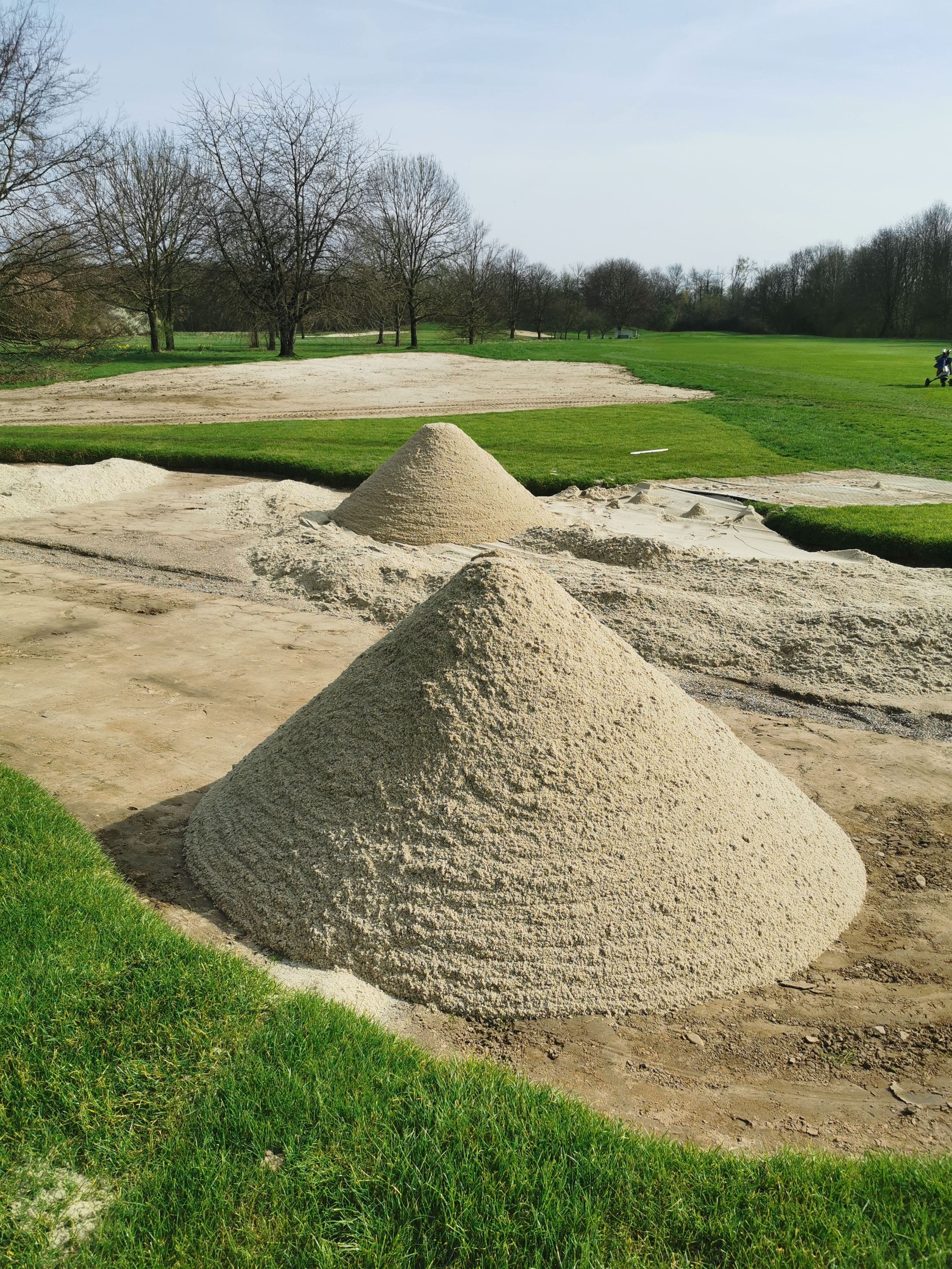 Die Bunkerarbeien auf den Bahnen 4 und 15 gehen weiter. Aktuell werden die Bunker mit Sand gefüllt. 140 Tonnen Sand werden nun auf die neuen Bunker verteilt.