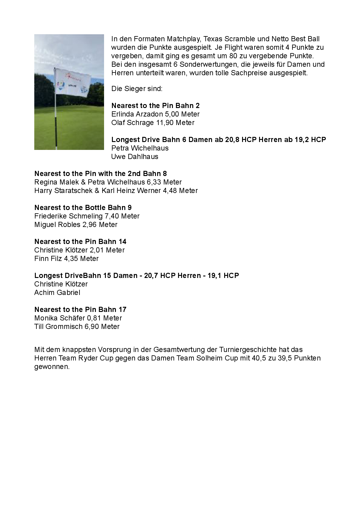 Herren gewinnen mit sehr knappem Vorsprung den Ryder Cup meets Solheim Cup am 07.07.2024