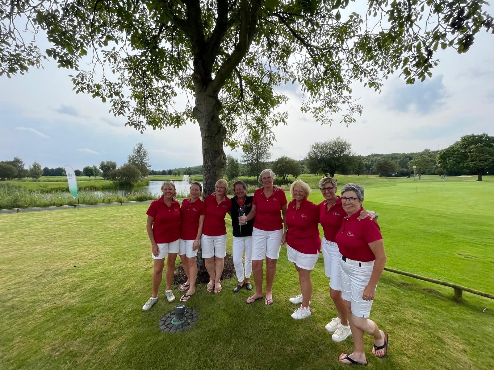 Spielerinnen, Coach Andreas Spiekerhoff, die mitgereisten Ehemänner Jürgen Röller, Uwe Dahlhaus und Michael Gwosdek als Caddies jubelten und beglückwünschten sich gegenseitig für diese tolle Teamleistung.
