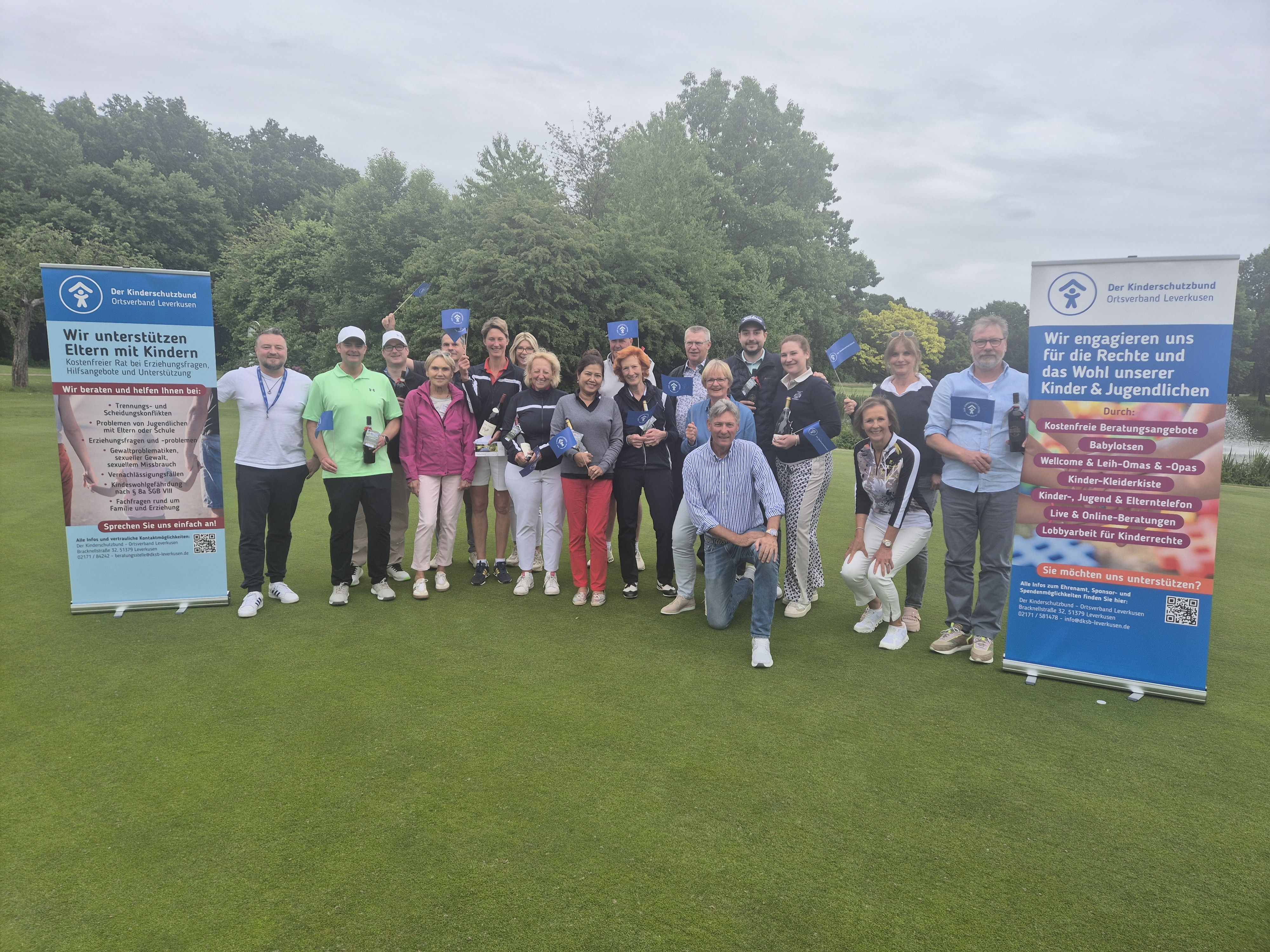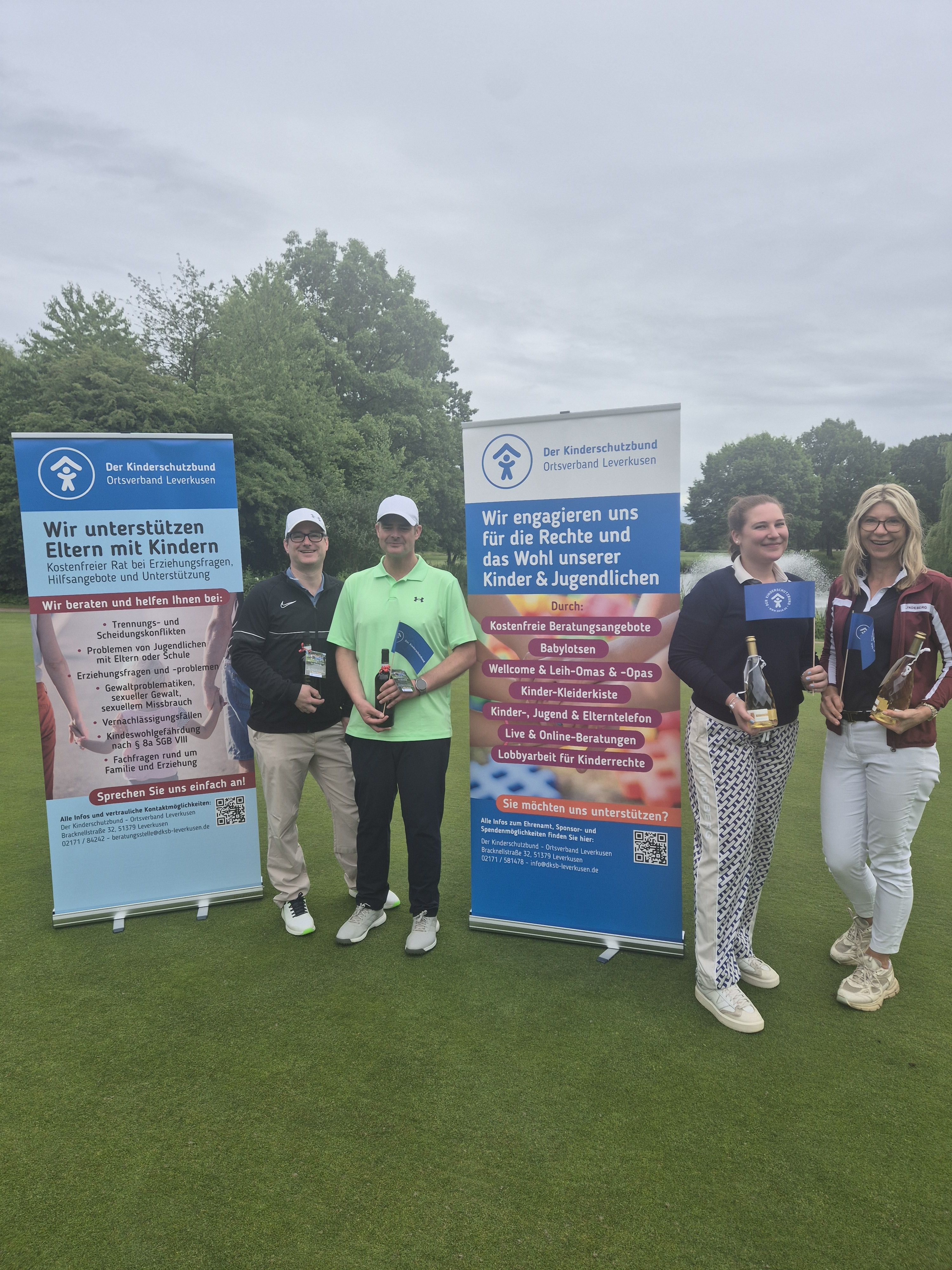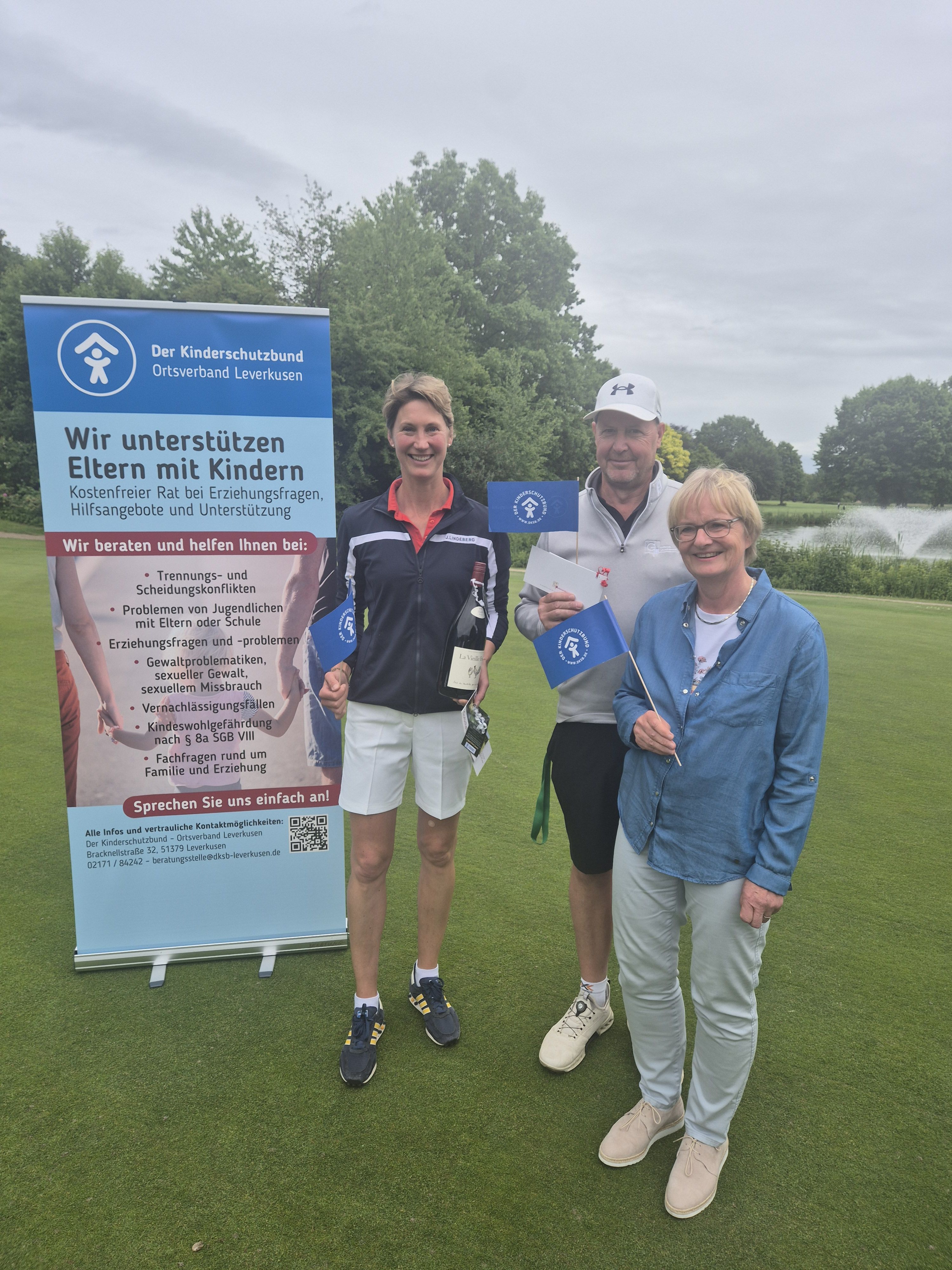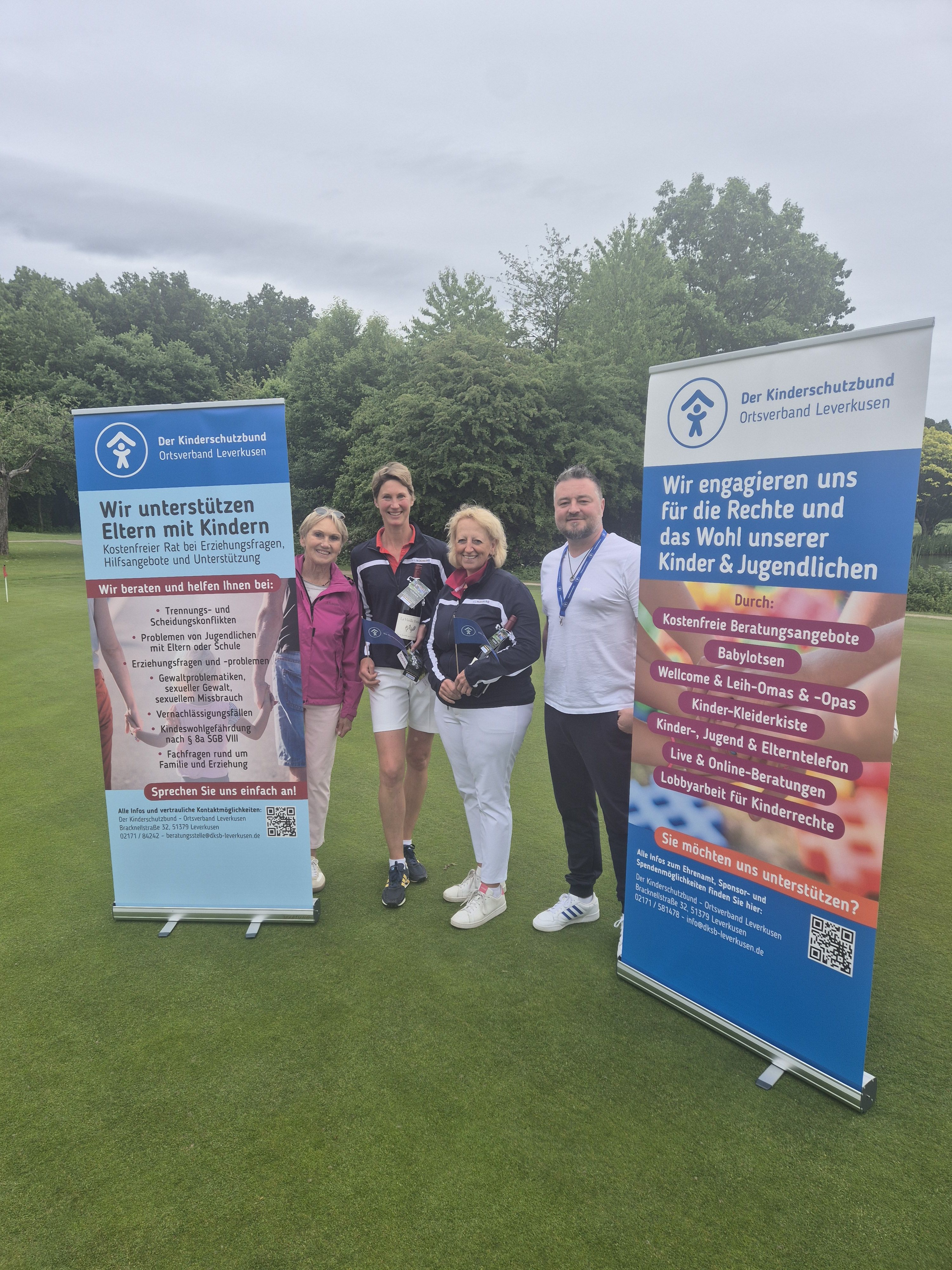 Stellvertretend entgegengenommen haben die Spenden Ingo Ende, ehemaliger Geschäftsführer des Kinderschutzbundes Leverkusen gGmbH, sowie Ellen Wolter, ehrenamtliche Mitarbeiterin des Kinderschutzbundes, die das Turnier mit großem Engagement organisiert hat: von der Dekoration über die Sponsorengewinnung bis zur Organisation der Turnierpreise: Dem gesamten ehrenamtlichen Team des Kinderschutzbundes, das auch für die Verpflegung auf der Runde gesorgt hat, gilt unser herzlicher Dank!