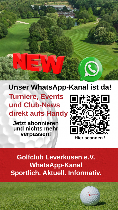 Abonniere unseren WhatsApp-Kanal - ganz einfach und bequem! Hier erfährst Du alles Wissenswerte rund um unseren Golfclub - von aktuellen Informationen, Turnieren und Events bis hin zu spannenden Einblicken hinter die Kulissen. Bleib immer auf dem Laufenden - direkt, schnell und bequem.