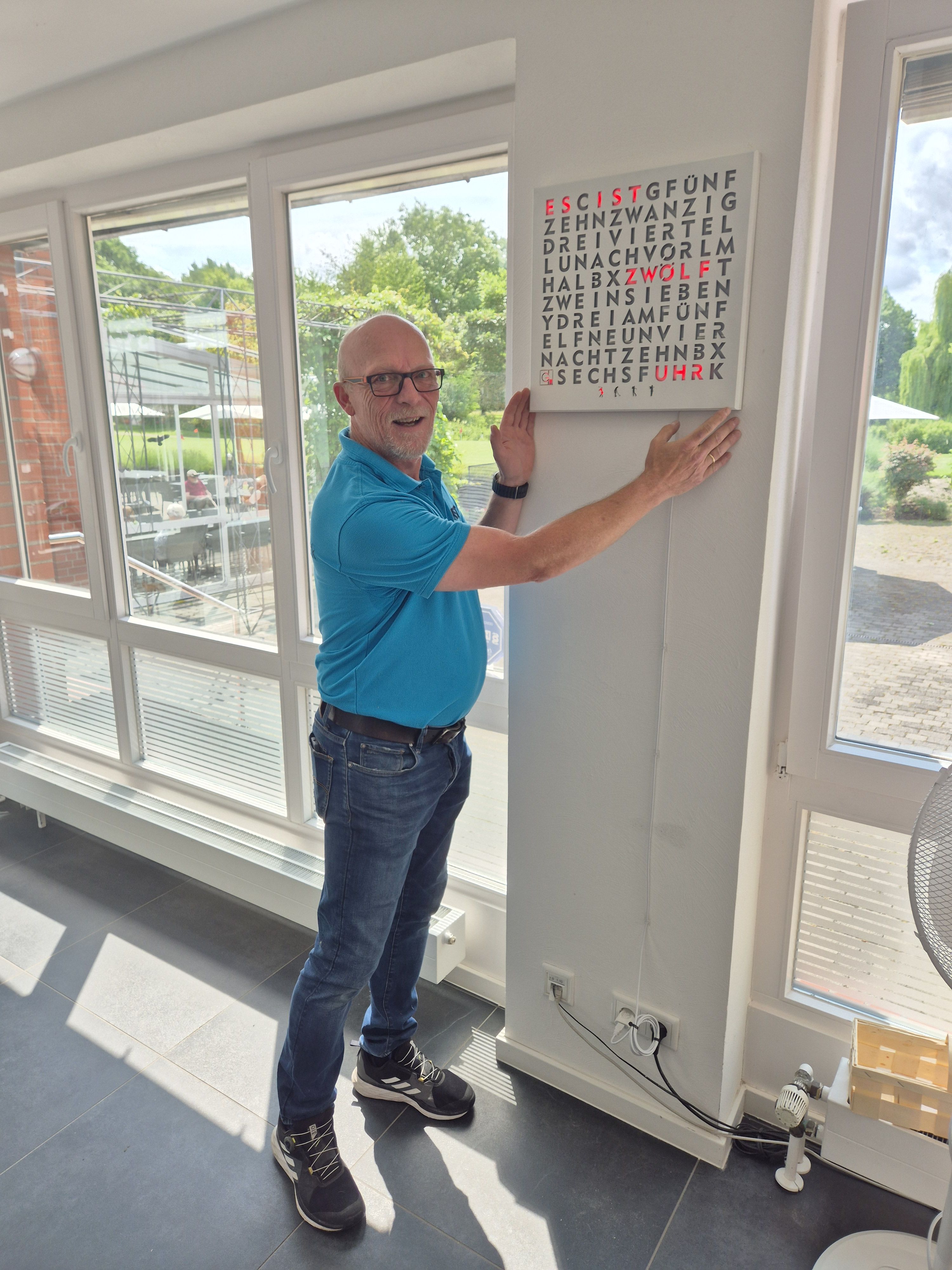 Wir freuen uns sehr, Ihnen ein ganz besonderes Highlight in unserem Clubhaus vorstellen zu dürfen: Unser Mitglied Stephan Tusch hat dem Golfclub Leverkusen eine handgefertigte Wortuhr geschenkt – ein einzigartiges Designerstück, das ab sofort unser Sekretariat schmückt.