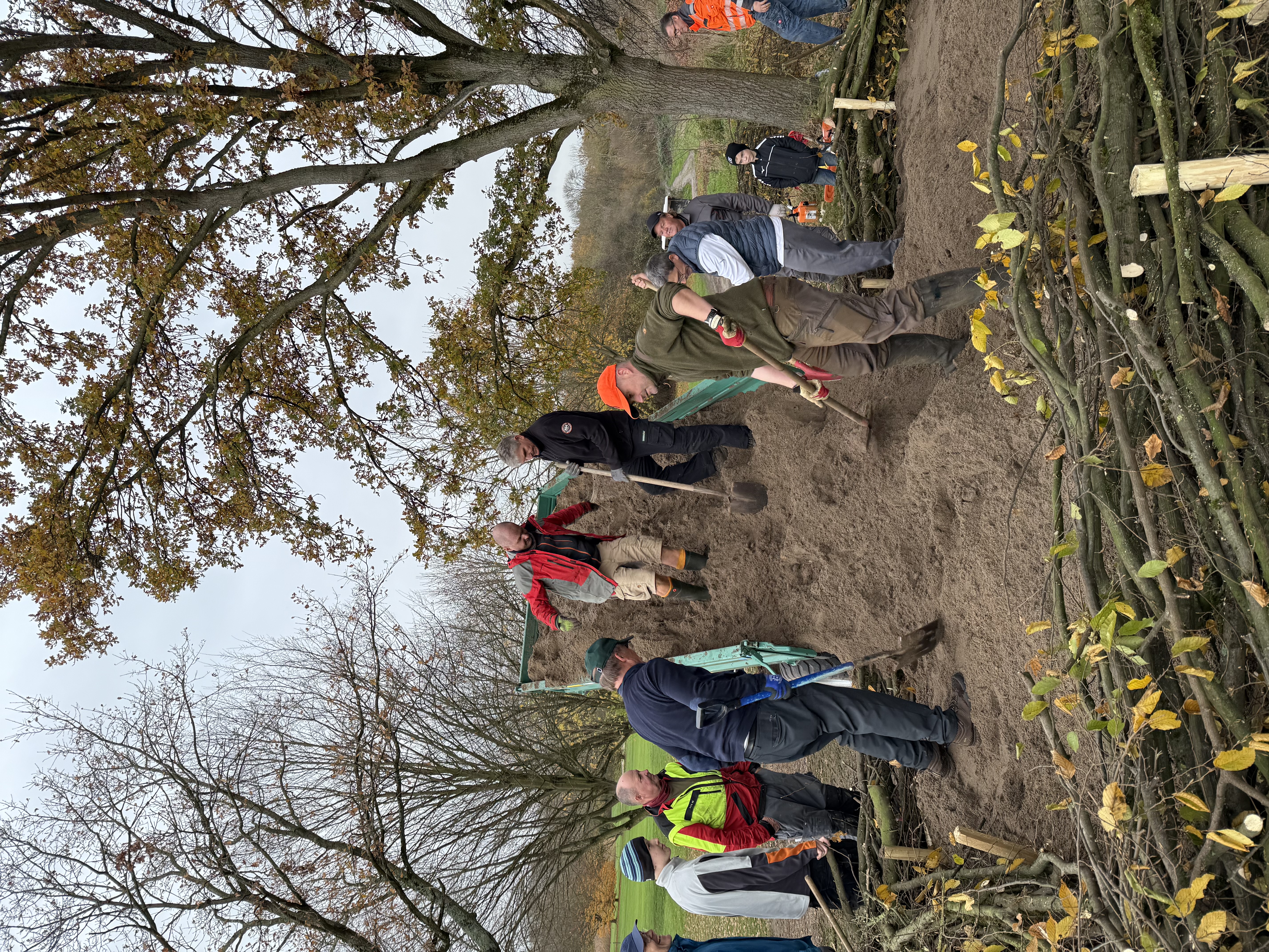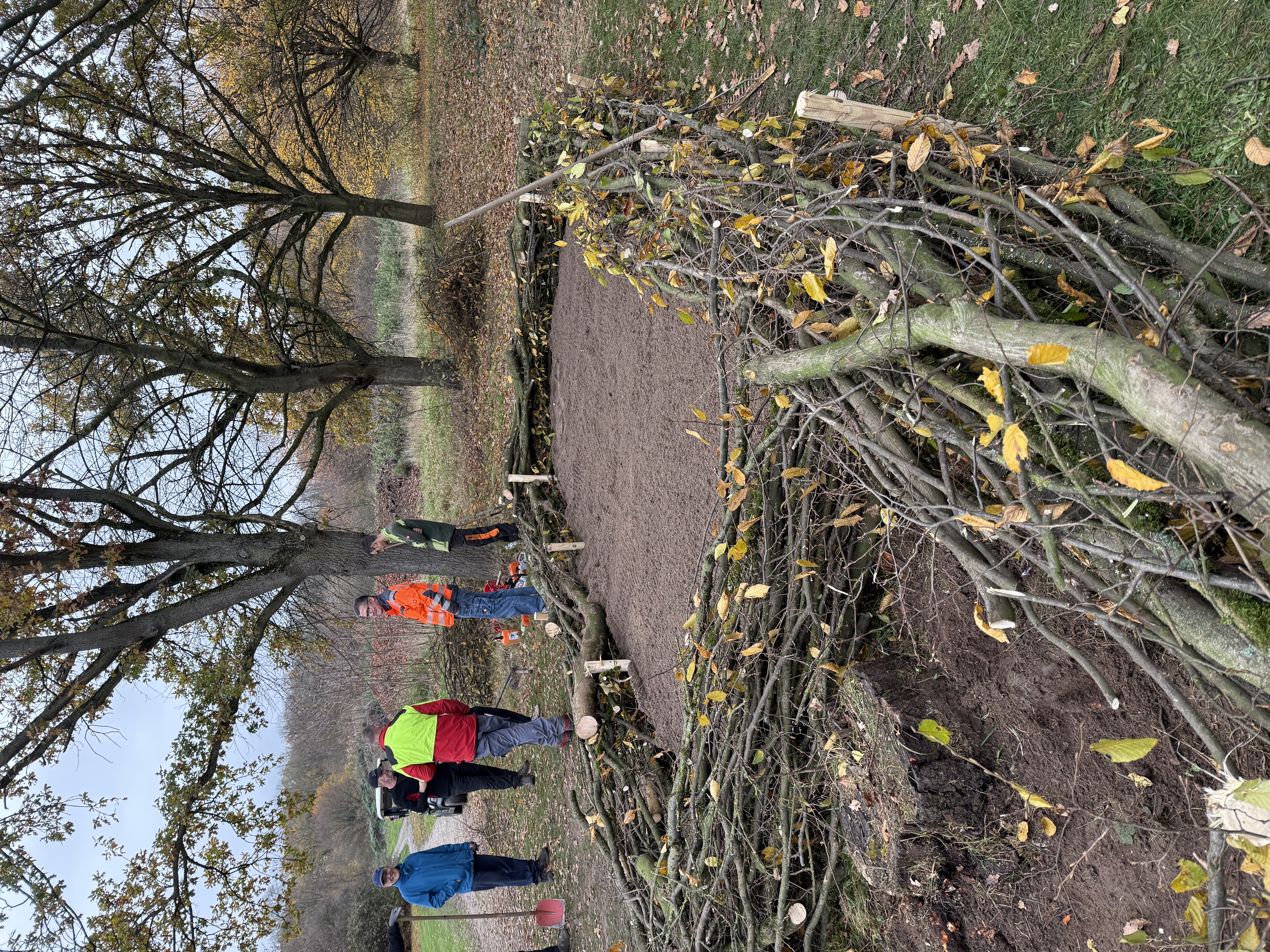 Ein besonderes Projekt an diesem Tag war der Bau eines Sandariums sowie einer Totholzmauer bei Bahn 13. Eine Gruppe kräftiger und gut gelaunter Helfer machte sich auf den Weg und sammelte in kürzester Zeit ausreichend Astmaterial, um die Umrandung des Sandariums zu gestalten.