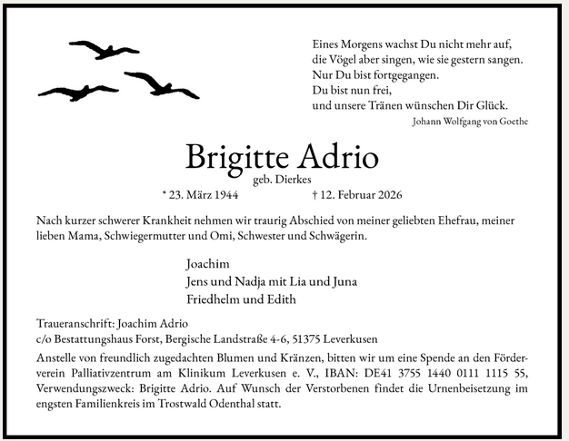 Unser tiefes Mitgefühl gilt ihrem Ehemann Dr. Joachim Adrio, ihrer Familie und allen, die ihr nahestanden.