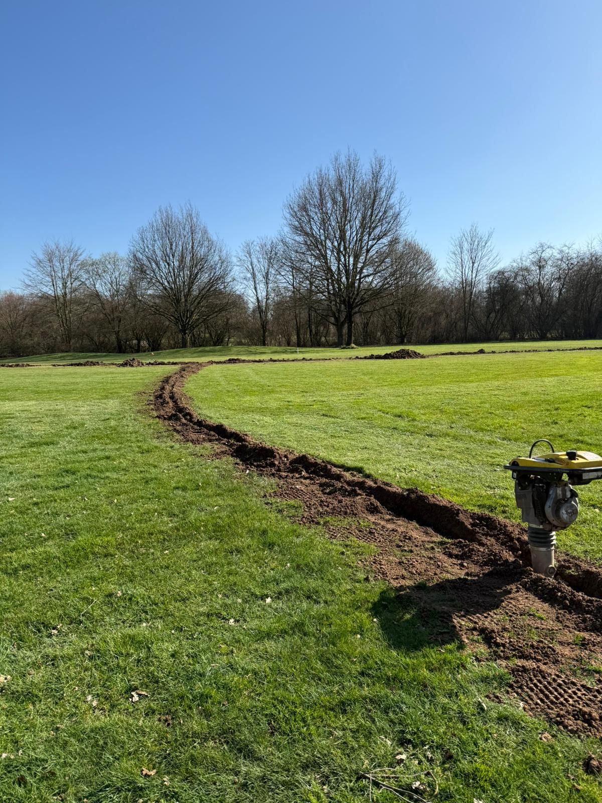 Im Rahmen der Bunkerarbeiten werden auf den Bahnen 1, 9 und 11 Drainagen im Bereich der Vorgrüns installiert, um die Entwässerung und damit die Bespielbarkeit der Flächen bei Näße zu verbessern.