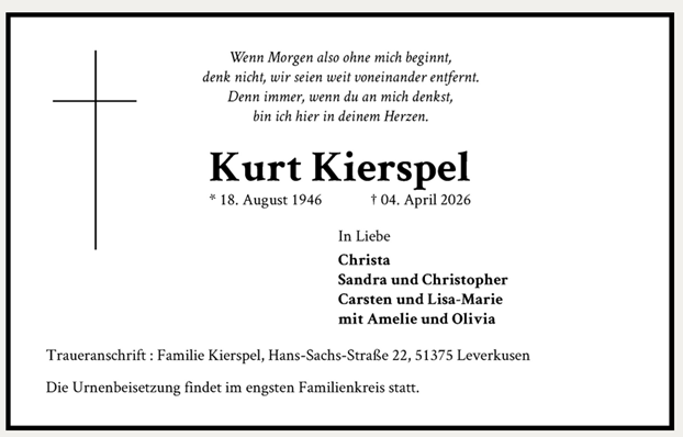 Unser Mitgefühl gilt seiner Ehefrau Christa Kierspelt und seinem Sohn Carsten. Für die kommende Zeit wünschen wir ihnen viel Kraft, Trost und Zusammenhalt.