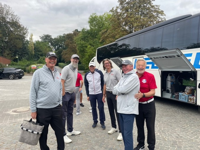 Die drei Tage wurden, wie in den Vorjahren, als Netto-Turnier veranstaltet. Das beste Gesamtnettoergebnis der 3 Runden gewinnt den Nettopokal. Der bester Bruttospieler wird ebenso mit einem Pokal geehrt. Mit dreißig Teilnehmern, vielen „Wiederholungstätern“ sowie mit einigen neuen Teilnehmern ging es am Freitagmorgen um 7:30 Uhr auf die Reise. Stefan F., unser Busfahrer von Hebbel, fuhr uns sicher zum ersten Spielort, dem Golfpark Bachgrund. Auf der Fahrt dahin konnten die Gewinner des letzten Jahres Martyn Bennett (Nettosieger) und Erik Düppen (Bruttosieger) die noch verschlafenen Teilnehmer verwöhnen. Martyn war für die belegten Brötchen zuständig und Erik hat den Kaffee im Bus gesponsert. Besonders zu erwähnen ist Claudia Bennett, die im Vorfeld - vermutlich zum überwiegenden Teil - für die leckeren Brötchen verantwortlich war. Dank an Claudia, es war sehr köstlich. Die Gruppe war sich einig, Martyn muss den Pokal verteidigen, um nächstes Jahr wieder in diesen Genuss zu kommen.