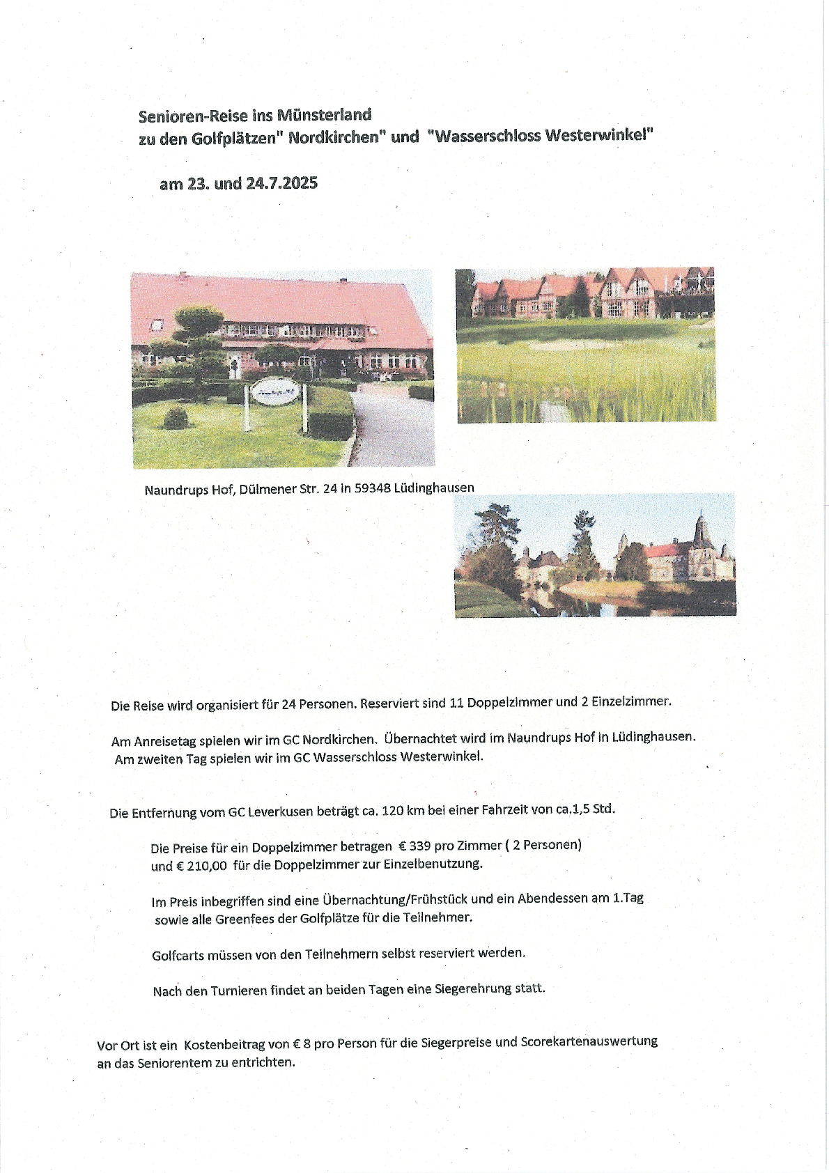 Wir spielen am Mittwoch im Golf- und Landclub Nordkirchen und am Donnerstag im GC Münster-Wilkinhege. Übernachtet wird im Hofhotel Grothues-Potthoff mit Frühstücksbuffet und einem 3-Gang-Menue am Abend.